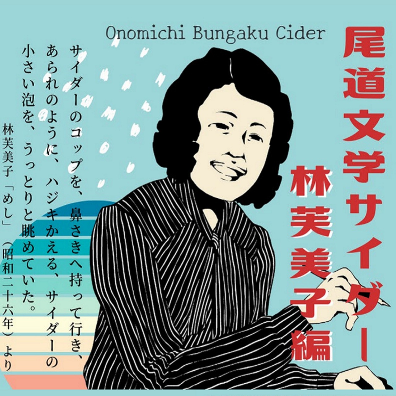 「サイダーのコップを、鼻さきへ持つて行き、あられのように、ハジキかえる、サイダーの小さい泡lを、うつとりと眺めていた。」尾道ゆかりの作家林芙美子の絶筆作品「めし(昭和26年)」の一節を再現した「尾道文学サイダー 林芙美子編」。